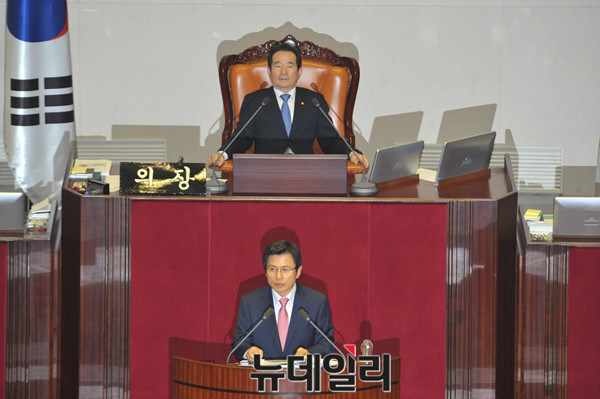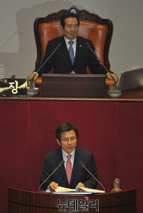 황교안 국무총리가 27일 오후 국회 본회의장에서 열린 제344회 임시회에서 추가경정예산안에 대한 시정연설을 하고 있다.