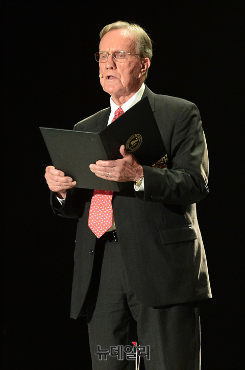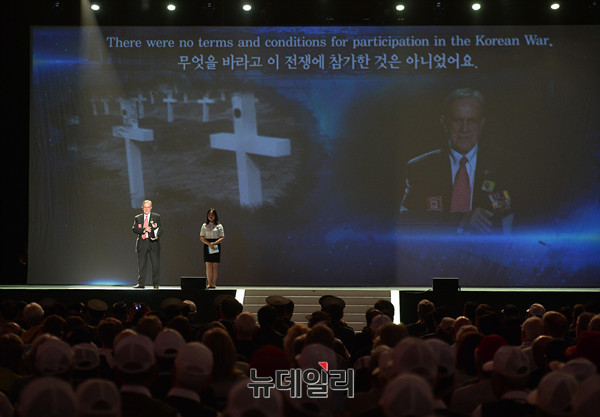 6.25전쟁에 참전했던 전쟁영웅 '워렌 위드한(Warren Wiedhahn)'씨가 27일 오전 서울 올림픽공원 올림픽홀에서 열린 '정전협정63주년 및 유엔군참전의날기념식'에 참석해 전쟁에 대한 회고를 하고 있다.