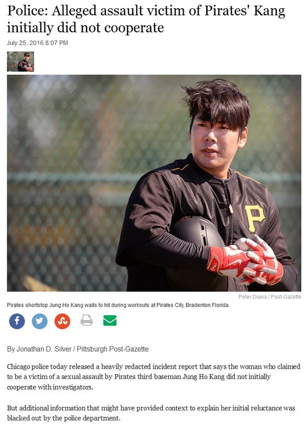 항간에 떠돌던 소문과는 달리 강정호를 성폭행 혐의로 고소한 장본인은 한국 교포 여성이 아닌, 23살의 백인 여성인 것으로 드러났다.