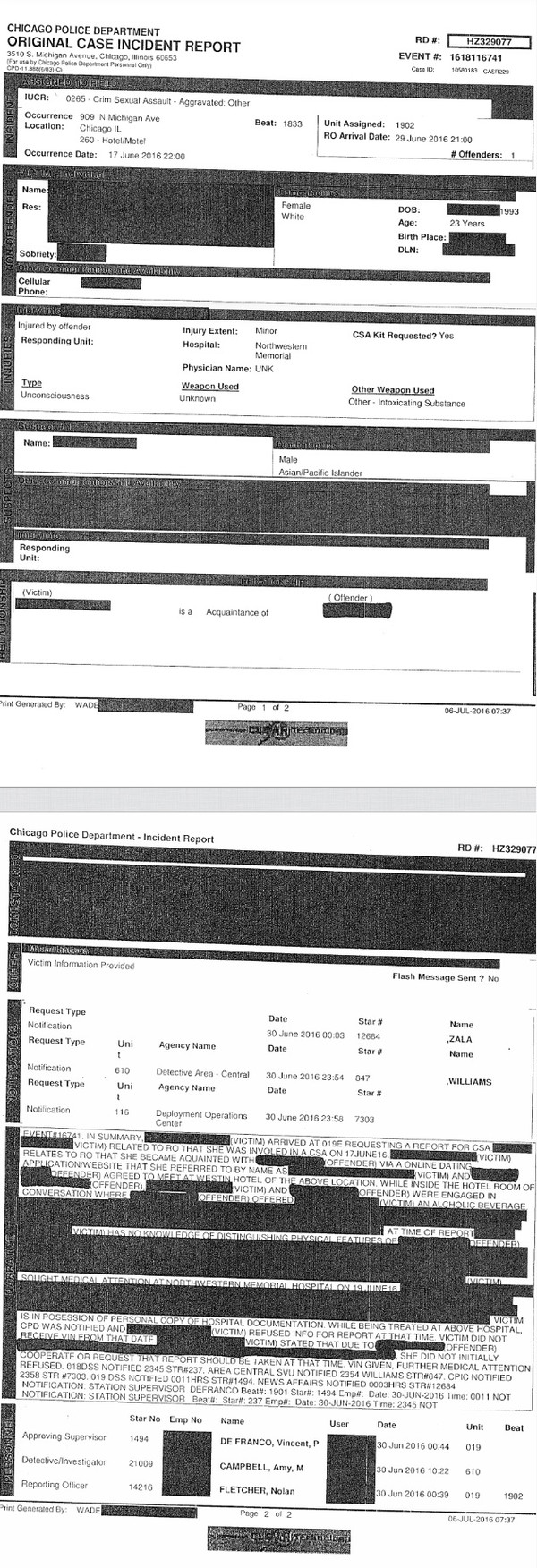 미국 일간지 피츠버그 포스트-가제트(Pittsburgh Post-Gazette)는 현지 시각으로 25일 일리노이(Illinois)주 시카고 경찰로부터 받은 사건 보고서(incident report)를 공개, "23살의 백인 여성이 6월 17일 오후 10시에 피해를 입고 19일 병원에서 '강간 조사(rape kit test)'를 받은 뒤 29일 오후 9시 경찰에 피해 신고를 했다"고 밝혔다.