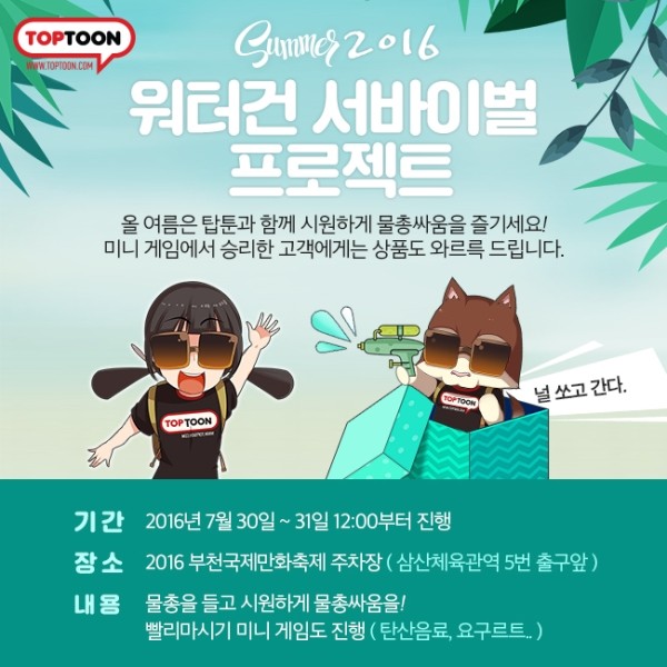 탑코믹스에서 운영하고 있는 웹툰 전문 플랫폼 탑툰이 '2016 부천국제만화축제'의 부대행사 중 하나인 '워터건 서바이벌'을 실시한다.'워터건 서바이벌'은 30일과 31일 정오부터 삼산체육관역 5번 출구 앞에서 약 700평 규모로 진행할 예정이다. 누구나 참여 가능하며, 안전을 위해 성인만 입장할 수 있는 '성인타임'과 아이들만 입장할 수 있는 '키즈타임'이 번갈아가며 운영된다.행사 중에는 미니게임 이벤트를 함께 선보인다. 성인은 탄산음료 빨리 마시기, 아이는 요구르트 빨리 마시기로 해당 게임에서 승리하면 외식상품권을 비롯해 다양한 상품을 받을 수 있다.현장에서는 물총을 무료로 대여해주며, 물품 보관소와 수건은 패키지로 저렴한 금액에 판매된다. 해당 패키지는 탑툰 공식 페이스북을 통해 워터건 서바이벌 게시물을 공유하면 50% 할인된 가격에 구매할 수 있다.탑툰은 7월 31일까지 열리는 '2016 부천국제만화축제'를 협찬하면서 축제에서 판매되는 모든 수익을 부천시에 전액 기부하는 등 문화적, 사회적 책임을 동시에 실천하게 된다.김춘곤 탑툰 대표는 "국내 최대 만화·웹툰 전문 축제인 부천국제만화축제에 협찬할 수 있게 되어 기쁘다"며 "만화와 웹툰을 좋아하는 독자들을 위해 무더운 여름을 날릴 수 있는 워터건 서바이벌을 준비했다. 많은 분들이 시원하게 보낼 수 있으면 좋겠다"고 말했다.[사진=탑툰]