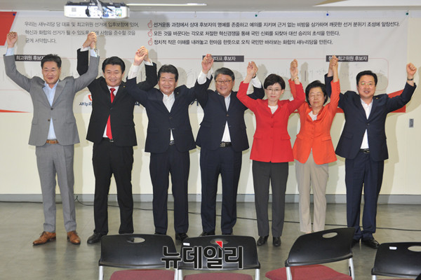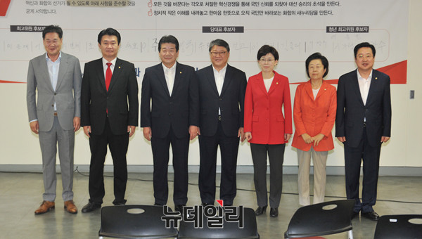 새누리당 전당대회 최고위원 후보들이 29일 오전 서울 여의도 당사에서 열린 '4차 전당대회 혁신과 화합의 선거 서약식'에서 기념사진을 촬영하고 있다.