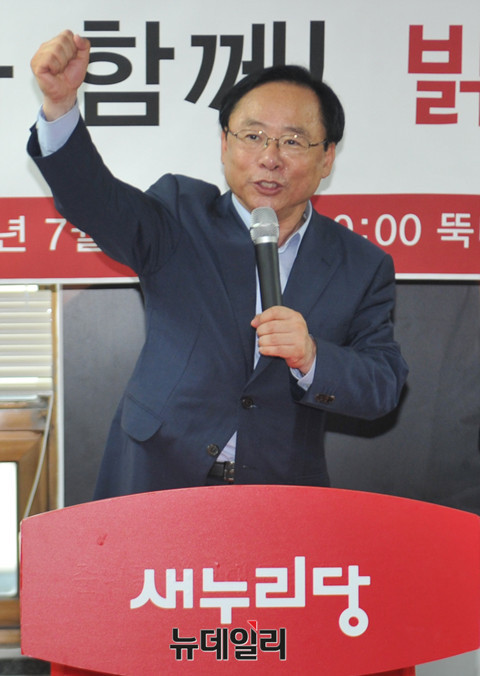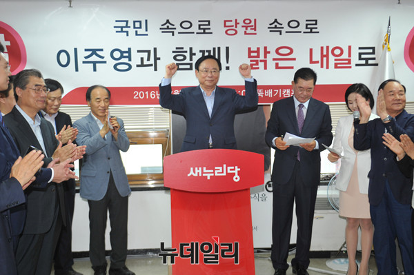 새누리당 8.9 전당대회 당권 주자인 이주영 의원(5선·경남 마산합포)이 29일 서울 여의도 자신의 선거사무소에서 '뚝배기 캠프' 출정식을 하고 있다.