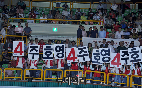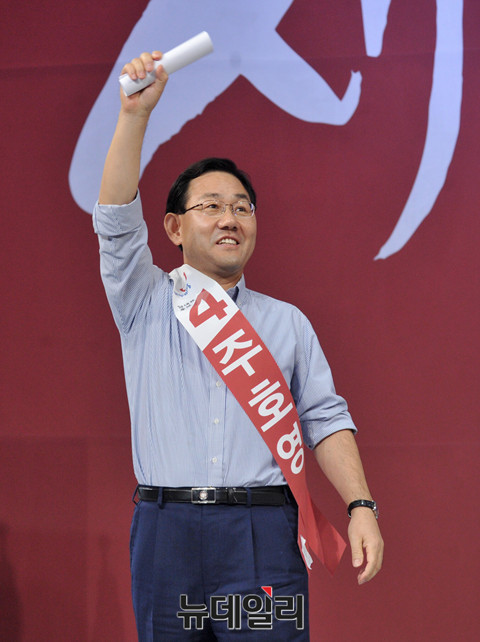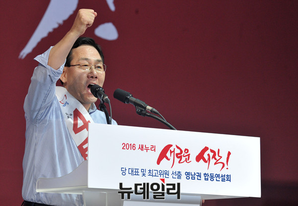 8.9 전당대회 주호영 새누리당 당 대표 후보가 31일 오후 경남 창원시 창원실내체육관에서 열린 당 대표 및 최고위원 선출 영남권 합동연설회에서 정견발표에 앞서 지지자들에게 인사를 하고 있다.
