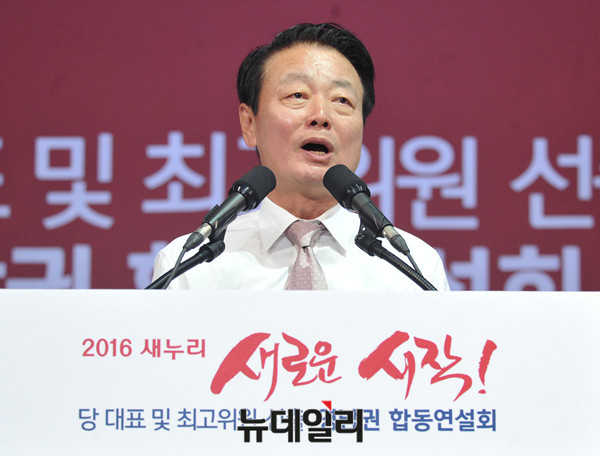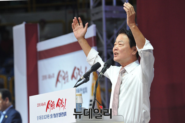 8.9 전당대회 한선교 새누리당 당 대표 후보가 31일 오후 경남 창원시 창원실내체육관에서 열린 당 대표 및 최고위원 선출 영남권 합동연설회에서 정견발표를 하고 있다.