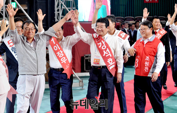 8.9 전당대회 새누리당 당 대표 후보 및 최고위원 후보, 청년 최고위원 후보가 31일 오후 경남 창원시 창원실내체육관에서 열린 당 대표 및 최고위원 선출 영남권 합동연설회에 입장하고 있다.