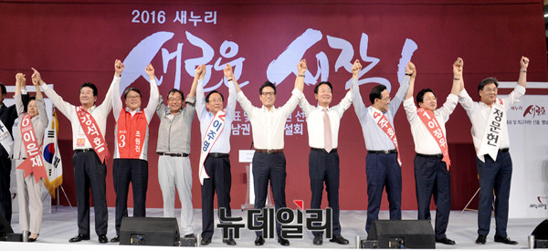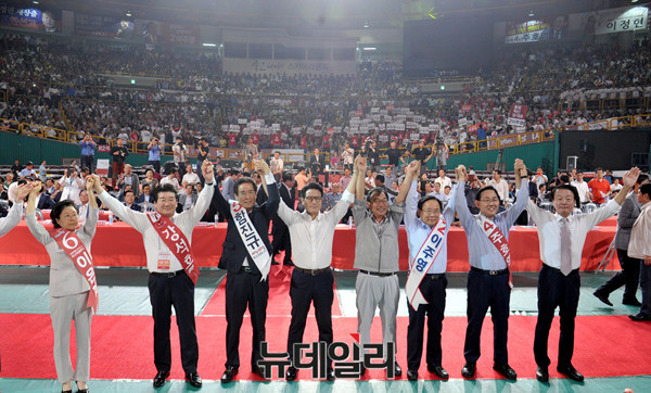 8.9 전당대회 새누리당 당 대표 후보 및 최고위원 후보, 청년 최고위원 후보가 31일 오후 경남 창원시 창원실내체육관에서 열린 당 대표 및 최고위원 선출 영남권 합동연설회에 손들어 인사하고 있다.