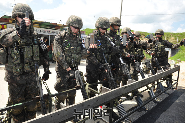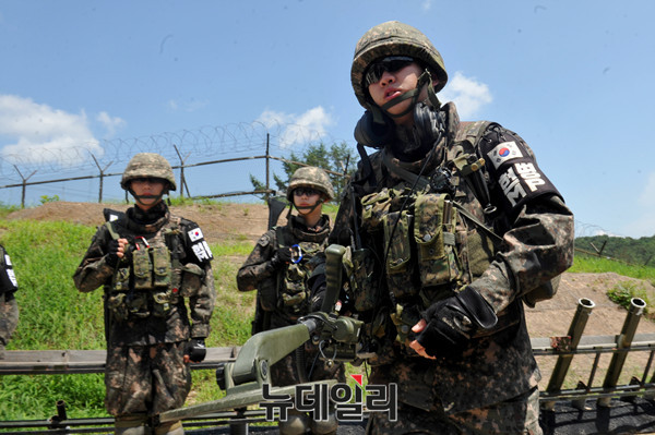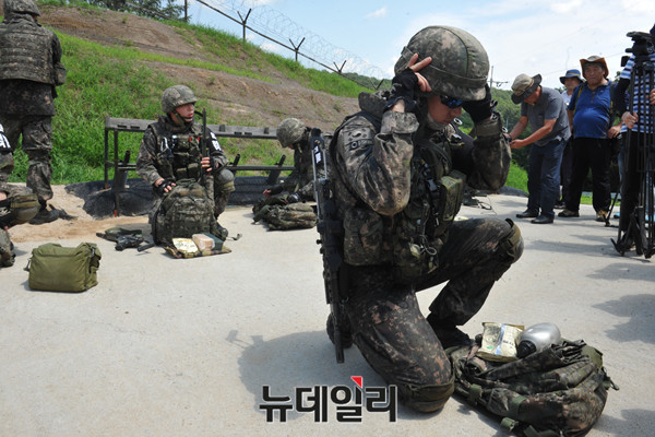 북한의 목함지뢰 1주기를 하루 앞둔 3일 육군 1사단 수색대대가 경기도 파주 DMZ 통문을 통과에 앞서 장비를 점검하고 있다.