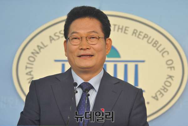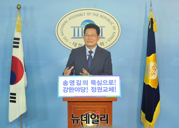 더불어민주당 송영길 당 대표 후보가 4일 오전 국회 정론관에서 가자회견을 갖고 "야 3당 정책공조를 통해 사드 재검토를 위해 국회의장 명의 국회비준 권한쟁의심판 청구를 추진하겠다"고 발언하고 있다.