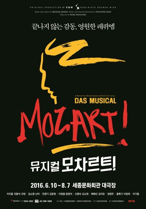 2016 뮤지컬 '모차르트!'가 서울공연을 성료하고 오는 20일부터 지방투어를 시작한다.'모차르트!'는 8월 20일~21일 대구 계명아트센터, 8월 27일~ 28일 광주문화예술회관 대극장, 9월 3일~4일 김해문화의전당 마루홀 공연을 통해 흥행 열기를 이어갈 예정이다.지난 6월 10일 세종문화회관 대극장에서 개막한 뮤지컬 '모차르트!'는 꾸준히 예매순위 상위권을 유지하며 호평 속 흥행가도를 달렸다.특히 이지훈, 전동석, 규현은 드레드락(Dreadlocks) 헤어 스타일과 찢어진 청바지를 입은 자유로운 뮤지션의 모습으로 무대에 올라 발군의 연기력과 가창력을 뽐내 관객들을 사로잡았다.또, 일본의 대표 뮤지컬 연출가 코이케 슈이치로가 2016년 '모차르트!'의 수장으로 합류해 모차르트의 천재성을 상징하는 '아마데'와 모차르트의 관계를 섬세하게 연출해 극의 개연성을 한층 높였다는 평가를 받았다.뮤지컬 '모차르트!'는 천재 음악가의 인간적 고뇌, 자기 자신과의 갈등과 같은 깊이 있는 주제를 탁월한 극본과 클래식하면서도 대중적인 넘버로 풀어내 2010년 한국 초연 이후 매 시즌 흥행신화를 써왔다.