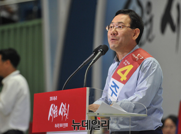 새누리당 주호영 당대표 후보가 9일 오후 서울 잠실실내체육관에서 열린 당대표 및 최고위원 선출 제4차 전당대회에서 정견발표를 하고 있다.이번 전당대회는 지난 7일 진행된 선거인단 투표와 국민여론 조사결과, 전당대회 현장에서 진행되는 대의원 투표결과를 합산해 새누리당 새지도부(당대표, 최고위원5명)을 선출한다. 투표결과는 오후 7시쯤 나올 예정이다.당대표 후보는 이정현, 이주영, 주호영, 한선교 의원이 최고위원 후보는 이장우, 정용기, 조원진, 정문헌, 함진규, 이은재, 최연혜 의원이 청년최고위원후보는 유창수, 이부형 의원이 각각 이름을 올렸다.