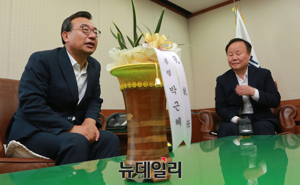 김재원 청와대 정무수석이 10일 오전 서울 여의도 새누리당 당사를 찾아 이정현 신임 대표를 예방하고 박근혜 대통령의 축하 난을 전달하고 있다.