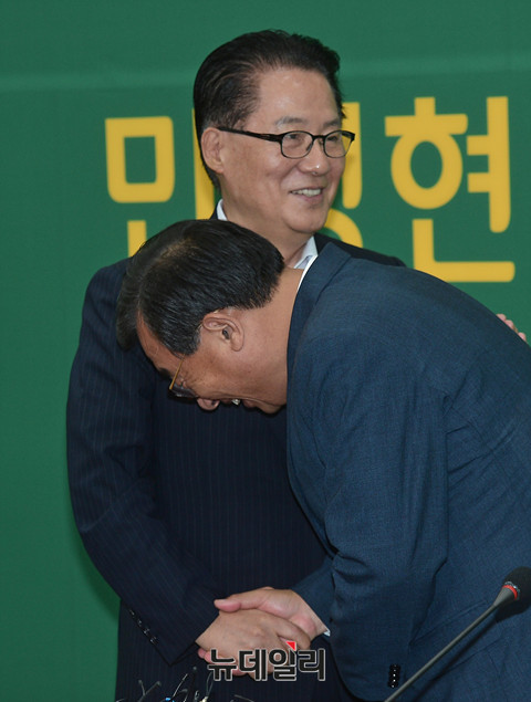 새누리당 이정현 신임 대표가 11일 오후 국회에서 국민의당 박지원 비대위원장을 예방하고, 악수를 나누고 있다.