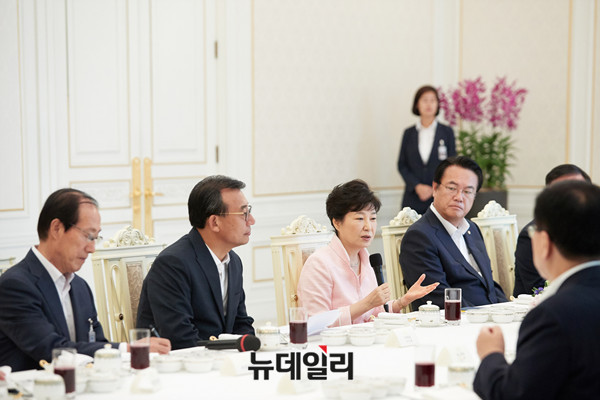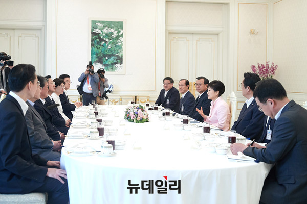 박근혜 대통령과 새누리당 이정현 신임 대표를 비롯한 신임지도부가 11일 오전 청와대에서 오찬회동을 가졌다.