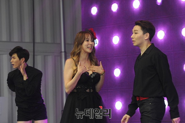 뮤지컬 '킹키부츠'에서 로렌 역을 맡은 배우 김지우가 16일 오후 서울 강남구 SJ쿤스트할에서 열린 제작발표회에 참석해 상대배우와 호흡을 맞추고 있다.