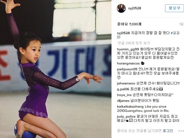 손연재는 지난 16일 "지금까지 정말 참 잘 왔다 #꼬꼬마"는 글과 함께 보라색 레오타드를 입고 연습에 몰두 중이던 과거 사진을 게재했다. 이에 관련 게시물을 접한 네티즌들은 "결과가 어떻든 다치지 말고 파이팅!" "떨지말고 멋진 모습 보여달라"는 다양한 댓글로 응원을 보내고 있다.