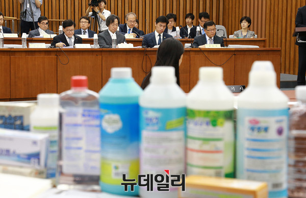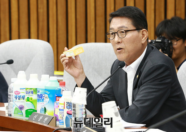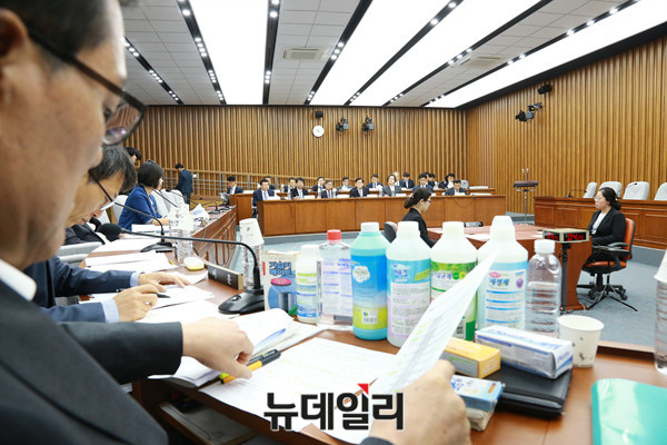 더불어민주당 신창현 의원이 17일 오전 국회에서 열린 '가습기살균제 사고 진상규명과 피해구제 및 재발방지 대책 마련을 위한 국정조사특별위원회' 전체회의에서 시중에 유통된 가습기살균제를 자리에 놓고 질문하고 있다.