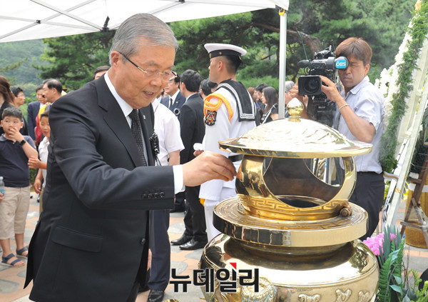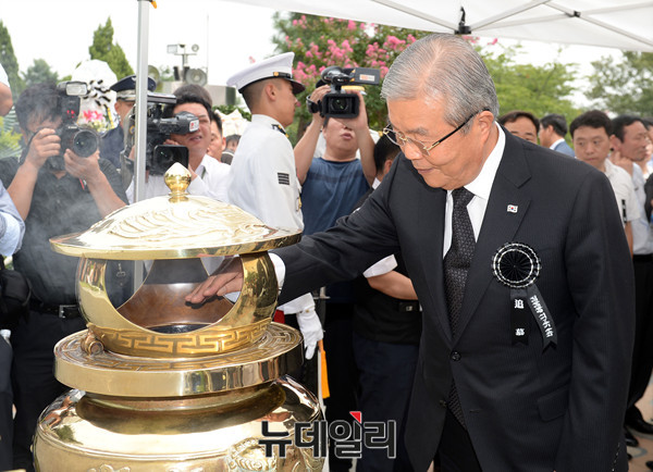 더불어민주당 김종인 비상대책 위원장이 18일 오전 서울 동작구 국립서울현충원에서 열린 김대중 전 대통령 서거 7주기 추도식에 참석해 묘역을 참배하고 있다.