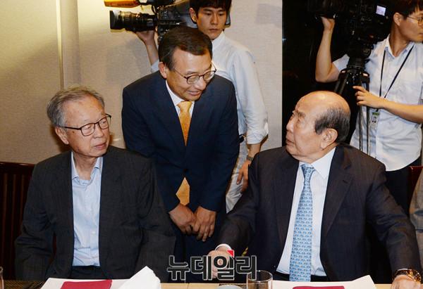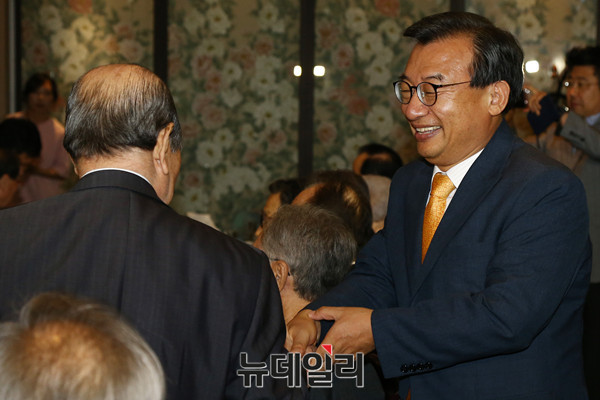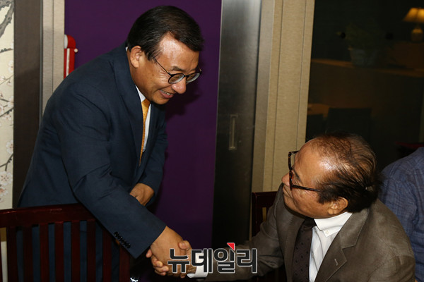 새누리당 이정현 대표가 19일 오후 서울 여의도 한 식당에서 열린 상임고문단 오찬에 참석해 참석해 김수한 전 국회의장, 박희태 전 국회의장, 등 참석자들과 인사를 하고 있다.