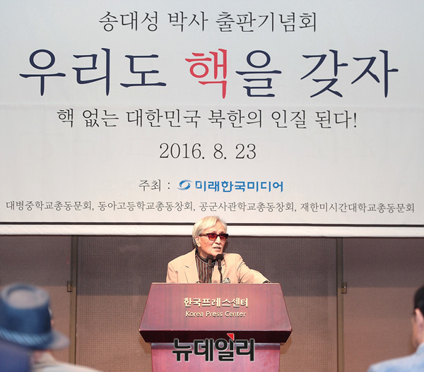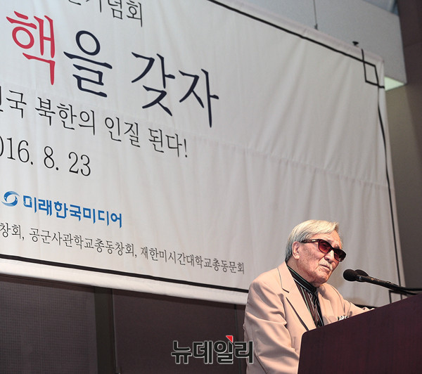 김동길 연세대학교 명예교수가 23일 오후 한국프레스센터에서 열린 '우리도 핵을 갖자' (송대성 저서) 출판기념회에 참석해 대한민국 안보의식의 중요성을 설명 하고 있다.