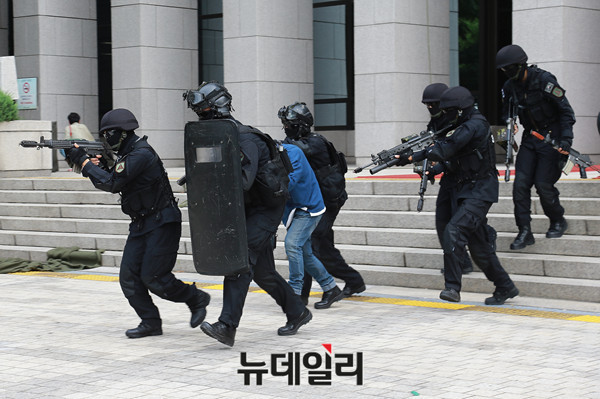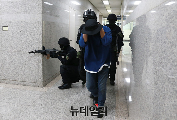2016 국회 을지연습 예행연습이 22일 오전 국회 도서관과 인근에서 벌어지고 있다. 이날 훈련은 국회 도서관에서의 테러가 발생한 상황을 가정해 열렸으며 경찰 특공대, 소방서 등이 참여 했다.