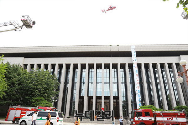 • 2016 국회 을지연습 예행연습이 22일 오전 국회 도서관과 인근에서 벌어지고 있다. 이날 훈련은 국회 도서관에서의 테러가 발생한 상황을 가정해 열렸으며 경찰 특공대, 소방서 등이 참여 했다.