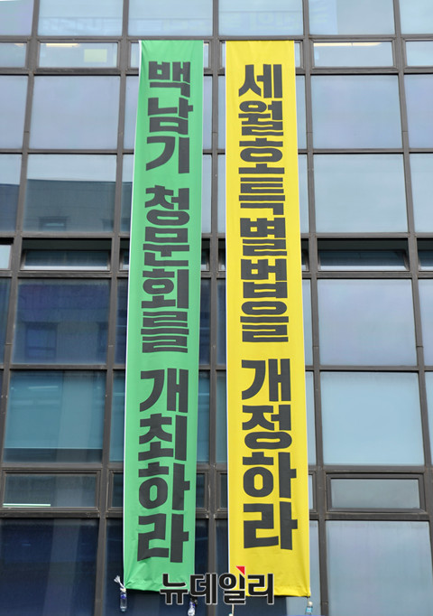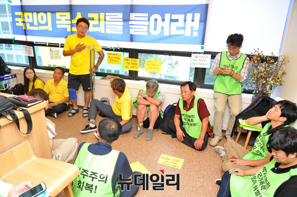 백남기대책위와 세월호 가족협의회가 25일 오전 서울 여의도 더불어민주당사에서 점거농성을 벌이고 있다.
