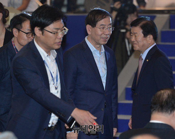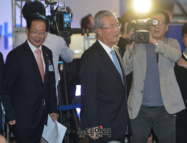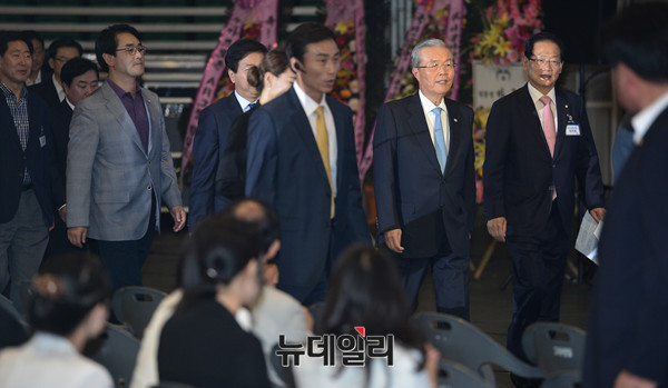 더불어민주당 김종인 비상대책위원장을 비롯한 당지도부가 27일 오후 서울 올림픽체조경기장에서 진행된 '더불어민주당 제2차 정기전국대의원대회'에 입장하고 있다.