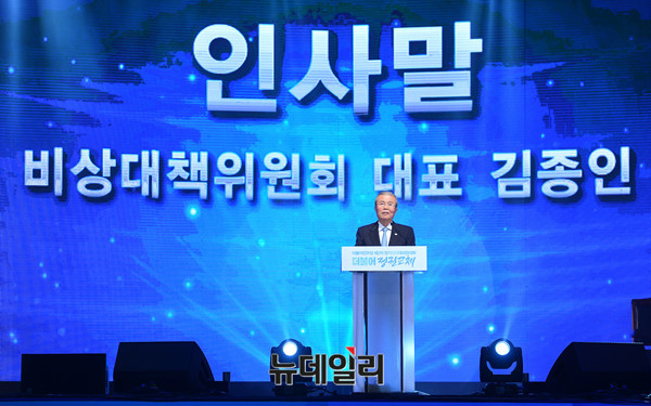 더불어민주당 김종인 비상대책위원장이 27일 오후 1시부터 서울 올림픽체조경기장에서 진행중인 '더불어민주당 제2차 정기전국대의원대회'에 참석해 인사말을 하고 있다.