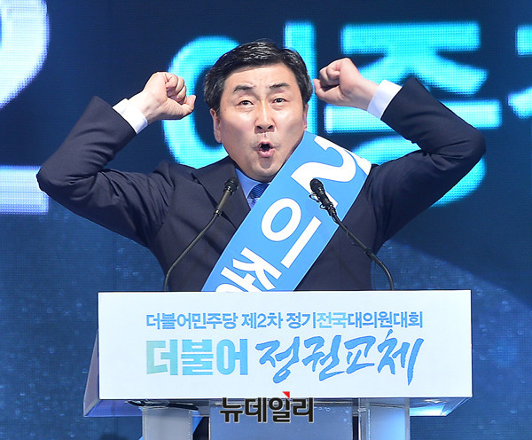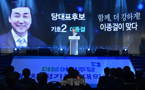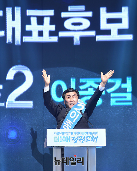 더불어민주당 이종걸 당대표 후보가 27일 오후 서울 올림픽체조경기장에서 진행중인 '더불어민주당 제2차 정기전국대의원대회'에서 정견발표를 하고 있다.