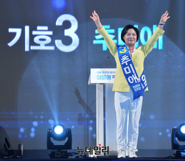 더불어민주당 추미애 당대표 후보가 27일 오후 서울 올림픽체조경기장에서 진행중인 '더불어민주당 제2차 정기전국대의원대회'에서 정견발표를 하고 있다.