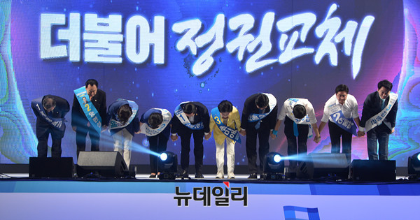 더불어민주당 당대표 후보와 최고위원 후보들이 27일 오후 1시부터 서울 올림픽체조경기장에서 진행된 '더불어민주당 제2차 정기전국대의원대회'에 참석해 대의원들에게 인사하고 있다.