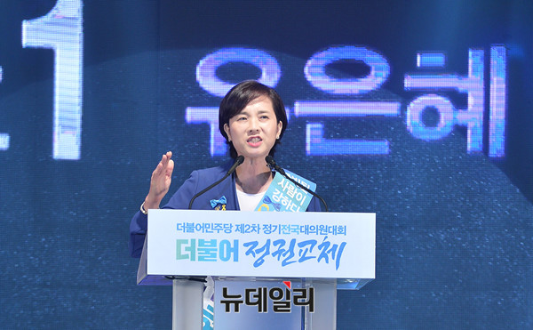 더불어민주당 유은혜 여성후보가 27일 오후 1시부터 서울 올림픽체조경기장에서 진행된 '더불어민주당 제2차 정기전국대의원대회'에 참석해 지지를 호소하고 있다.