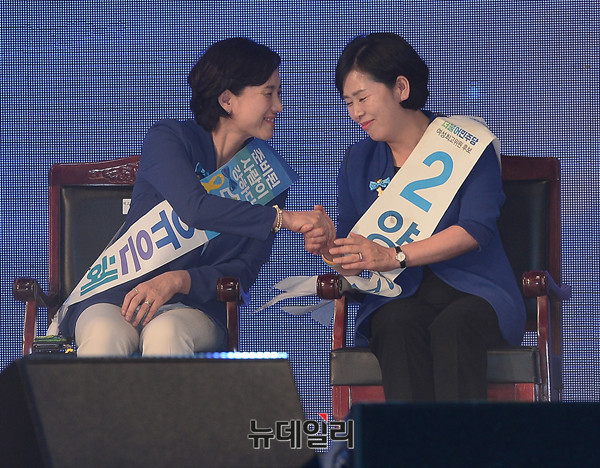 더불어민주당 여성최고위원 유은혜 후보가 27일 오후 서울 올림픽체조경기장에서 진행된 '더불어민주당 제2차 정기전국대의원대회'에서 투표결과가 발표되자 양향자 후보에게 축하의 인사를 전하고 있다.