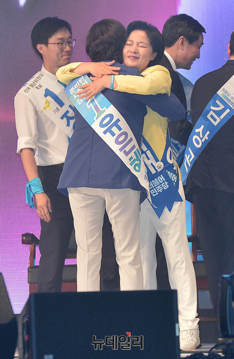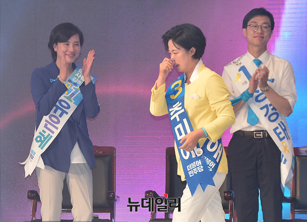더불어민주당 추미애 후보가 27일 오후 서울 올림픽체조경기장에서 열린 '더불어민주당 제2차 정기전국대의원대회'에서 투표결과가 발표되자 눈물을 훔치며 당대표 수락연설을 하기 위해 이동하고 있다.