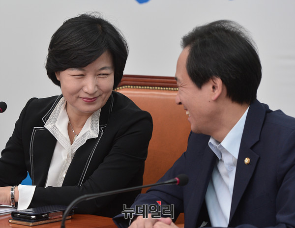 더불어민주당 추미애 신임당대표와 우상호 원내대표가 29일 오후 국회 더불어민주당 대표회의실에서 열린 첫 최고위원회의에 참석해 대화를 나누고 있다.