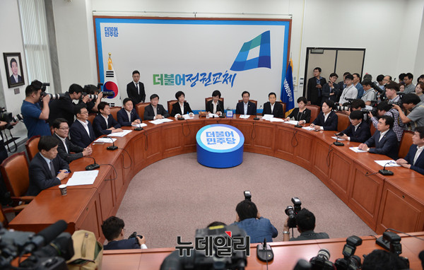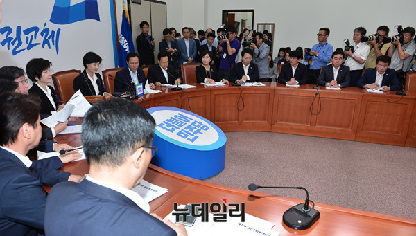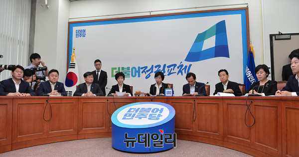 더불어민주당 추미애 신임당대표와 신임지도부가 29일 오후 국회 더불어민주당 대표회의실에서 열린 첫 최고위원회의에 참석해 발언하고 있다.