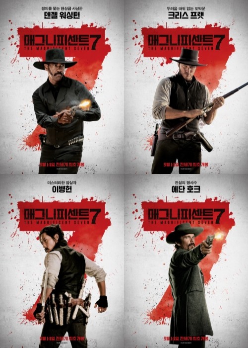 와일드 액션 블록버스터 '매그니피센트7'(감독 안톤 후쿠아)이 각 캐릭터의 매력을 한 눈에 볼 수 있는 포스터를 공개했다.공개된 '매그니피센트 7' 포스터에는 주연배우 4명인 덴젤 워싱턴, 크리스 프랫, 이병헌, 에단 호크의 카리스마 넘치는 모습이 붉은 '7'이라는 숫자와 함께 어우러져 있다.정의를 쫓는 현상금 사냥꾼 '샘 치좀' 역의 덴젤 워싱턴은 극의 축을 세우는 캐릭터답게 그 어떤 위기에도 흔들리지 않을 듯한 모습으로 시선을 사로잡는다.이어 다채로운 매력으로 전세계 여심을 사로잡고 있는 크리스 프랫은 특유의 에너지 넘치는 모습으로 유머 감각 넘치는 도박꾼 '조슈아 패러데이'를 표현해냈다.이병헌 역시 캐릭터 포스터에서 존재감을 발산한다. 특히, 유일하게 총기류가 아닌 나이프를 무기로 하는 이병헌은 허리에 7개 이상의 칼을 차고 있어 그만의 차별화된 액션이 기대감을 더한다.마지막으로 전설의 명사수 '굿나잇 로비쇼' 역을 맡은 에단 호크는 흔들림 없는 자세로 적을 겨누고 있어 그가 선보일 카리스마에 대한 호기심을 증폭시킨다.한편, '매그니피센트7'은 정의가 사라진 마을을 지키기 위해 7인의 무법자들이 한데 모이게 되면서 통쾌한 복수를 시작하는 영화로, 9월 14일 전 세계 최초 개봉한다.[사진=UPI 코리아]