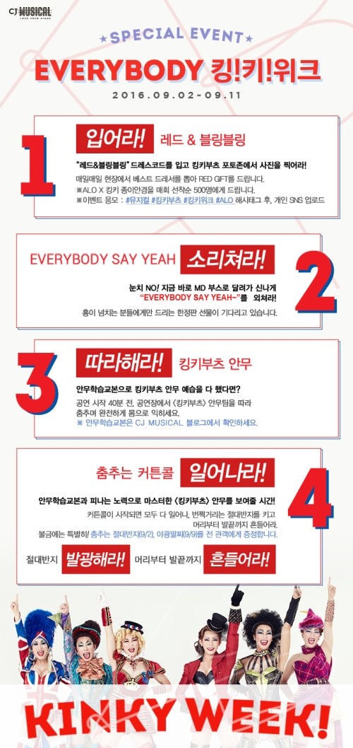 블루스퀘어를 빨갛게 물들일 준비를 마친 뮤지컬 '킹키부츠'가 개막을 기념해 특별한 이벤트를 펼친다.'킹키부츠'는 뮤지컬을 관객과 함께 소통하고 즐기기 위해 9월 2일부터 11일까지 '킹키위크'라는 이벤트를 선보인다. 이미 대림 콜라보 쇼케이스 등 관객과 교감하는 다양한 이벤트들을 진행한 바 있다.앞서 CJ E&M의 박민선 본부장은 "단순히 관객들이 보는 입장이 아니라 함께 즐길 수 있는 여러 가지 전략을 세우고 있다"라고 밝히기도 했다.9월 2일 블루스퀘어 삼성전자홀에서 개막하는 '킹키부츠'는 CJ E&M이 공동 프로듀서로 제작에 참여한 대한민국이 만든 브로드웨이 뮤지컬로, 제리미첼 연출과 팝스타 신디 로퍼의 작사∙작곡으로 초연 당시 화제를 모았다.파산 위기에 빠진 구두공장을 물려받은 찰리와 아름다운 남자 롤라의 만남을 그리며 이지훈, 김호영, 정성화, 강홍석, 김지우, 고창석, 심재현, 신의정 등이 출연한다.