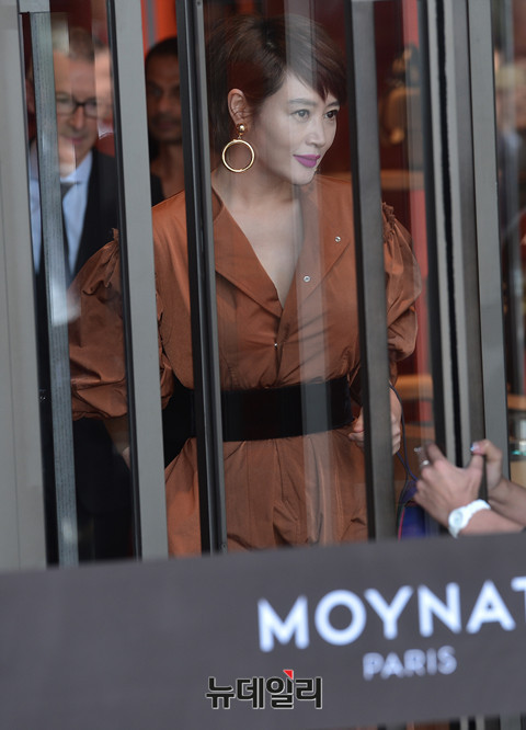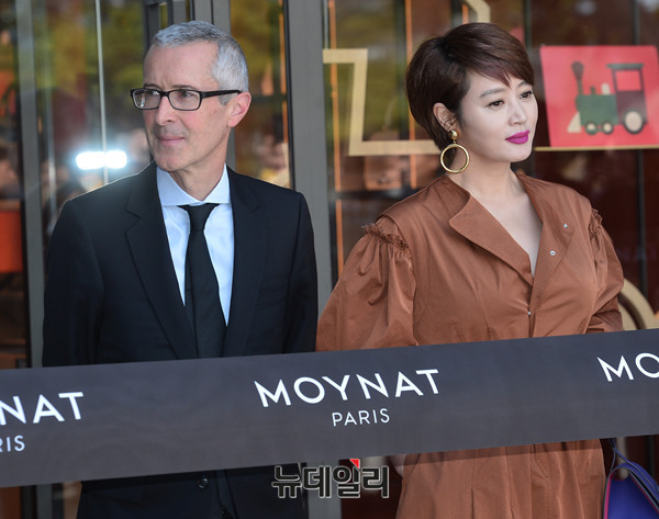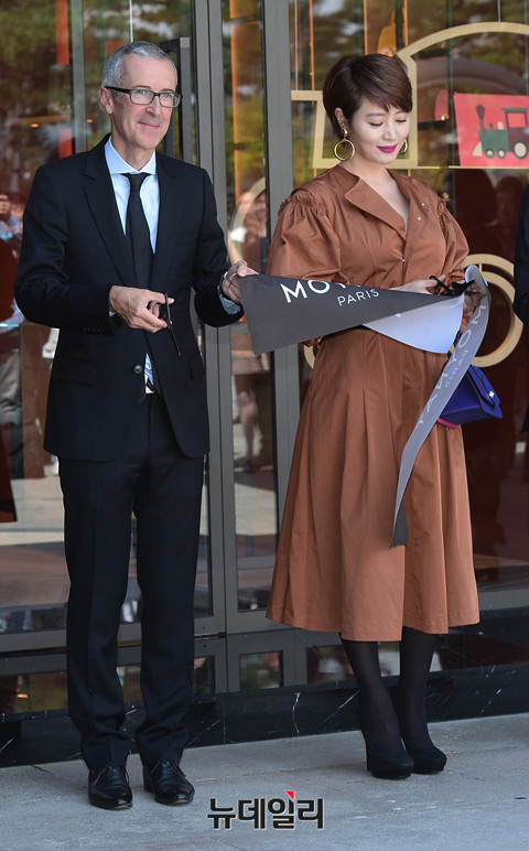 '라메시 나이르' 모이나 크리에이티브 디렉터, '기욤 다빈' 모이나 대표, 배우 김혜수, 허병훈 신라호텔 전무(왼쪽부터)가 30일 오전 서울신라호텔에서 열린 프랑스 백&트렁크 브랜드 '모이나(Moynat)' 한국 공식 론칭 행사에 참석해 리본커팅식을 진행하고 있다.