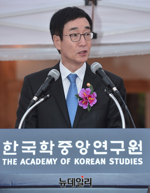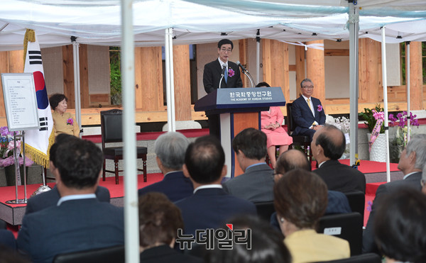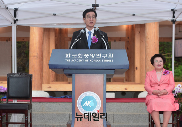 이준식 교육부장관이 31일 오후 경기 성남시 한국학중앙연구원 내 청계학당에서 진행된 '한국학중앙연구원 청계학당' 준공 기념식에서 축사를 하고 있다. 이날 준공기념식에는 이준식 교육부장관, 나선화 문화재청장, 이배용 원장, 손병두 이사장 등 교직원 및 대학원생 등이 참석했다.