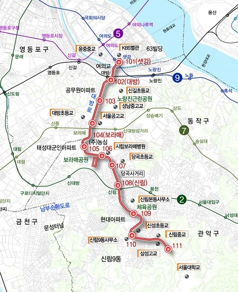 신림선 도시철도는 영등포구 여의도동 샛강역을 출발해 국철 대방역, 7호선 보라매역, 2호선 신림역을 거쳐 서울대 앞까지 연결하는, 총 연장 7.8km 구간이다. 구간 내 정거장 11개소, 차량기지 1개소는 모두 지하에 건설할 예정이다.