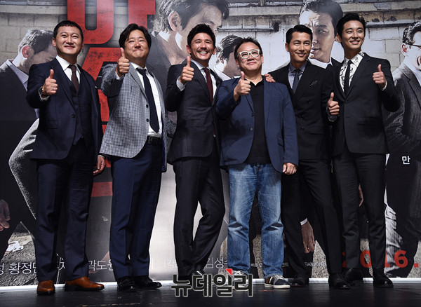 영화 '아수라' 감독과 배우들(정우성, 황정민, 주지훈, 곽도원, 정만식)이 1일 오전 압구정CGV에서 열린 기자간담회에 참석해 포토타임을 갖고 있다.
