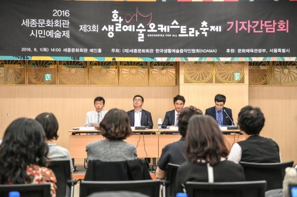 세종문화회관의 '생활예술오케스트라 축제-모두를 위한 오케스트라'가 올해 3회를 맞아 세계적인 커뮤니티로 도약할 힘찬 첫 걸음을 뗀다.오는 10월 유엔협회세계연맹(WFUNA) 70주년 및 유엔의 날 기념으로 서울시민필하모닉오케스트라, UN오케스트라와 합동공연을 올리는 데에 이어 2017년에는 세계 생활예술오케스트라 축제(ICOF)를 개최해 한걸음 나아가는 것.박승현 세종문화회관 문화예술본부장은 1일 오후 세종문화회관 예인홀에서 열린 기자간담회에서 "서울시와 세종문화회관은 시민오케스트라 네트워크인 코아마(KOAMA)와 함께 2017 세계생활예술오케스트라 축제를 위한 2개년 프로젝트를 지난 1월부터 추진해 왔다"고 밝혔다.이어 "2017년에는 세계생활예술오케스트라 축제를 개최해 파라과이의 랜드필 오케스트라를 비롯해 대표적인 해외 커뮤니티 오케스트라들을 초청, 한국이 커뮤니티오케스트라의 구심점이 될 수 있는 계기와 국제적 교류의 장을 마련한다"고 덧붙였다.10월 14일부터 23일까지 세종문화회관 대극장과 M씨어터, 체임버홀에서 열리는 '제3회 생활예술오케스트라 축제'는 다양한 편성과 탄탄한 실력을 갖춘 오케스스트라들이 대거 참여해 수준 높은 공연을 펼칠 예정이다.세종문화회관과 한국생활예술음악인협회(KOAMA, 이하 '코아마')가 이끄는 '생활예술오케스트라 축제'는 자발적으로 형성된 전국의 커뮤니티오케스트라 단체들에게 꿈의 무대를 제공해 누구나 음악으로 즐기는 자리를 만들고자 2014년부터 개최되었다.이승엽 세종문화회관 사장은 "21세기 풍경 속에 가장 두드러진 분야는 예술교육이다. 이중 한국판 '엘 시스테마'로 불리는 '생활예술오케스트라'가 자리를 잡았다. 올해 이 축제가 질적·양적으로 다양하고 풍성하게 성황을 이루게 된 것은 코아마의 자발적인 움직임이 컸다. 많이 성원해 달라"고 말했다.