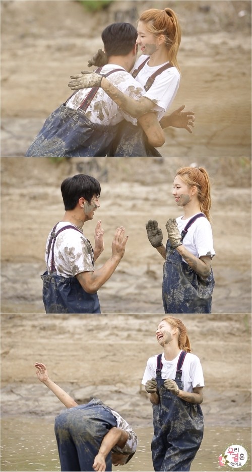 '우결' 조타-김진경의 손바닥 밀치기 게임 현장이 포착됐다.3일 방송될 MBC '우리 결혼했어요'(이하 '우결')에서는 장어잡이에 나선 '삼삼 커플' 조타-김진경의 모습이 그려진다.이날 조타-김진경은 직접 잡은 장어를 구워 먹으며 몸보신 타임을 가질 예정이다. 이 과정에서 두 사람은 장어도 잡고, 사랑도 잡는 일석이조의 시간을 누렸다.그런 가운데, 조타-김진경의 손바닥 밀치기 게임 현장 컷이 공개돼 눈길을 끈다. 두 사람은 진흙탕 위에서 크게 웃으며 광대가 승천한 모습으로, 닿을락 말락한 미묘한 터치의 순간을 보여준다.앞서 조타-김진경은 승부 앞에서 절대 승부를 양보하지 않는 모습을 보여준 상황. 김진경은 "힘에서 내가 지잖아. 불리하잖아요"라며 남편 앞에서 앙탈 아닌 앙탈을 부렸다, 가까운 거리에 있던 두 사람은 이내 묘한 분위기를 발산했다.이에 조타는 "유일한 타이밍이었어요~ 아쉬움이 좀 많이 남아요"라며 승패가 아닌 스킨십을 언급, 활활 타오르는 시골 로맨스로 분위기를 후끈 달아오르게 한 것으로 전해졌다.조타-김진경의 묘한 게임 현장은 9월 3일 오후 4시 55분 방송되는 '우리 결혼했어요'에서 확인할 수 있다.['우리결혼했어요' 조타 김진경, 사진=MBC]