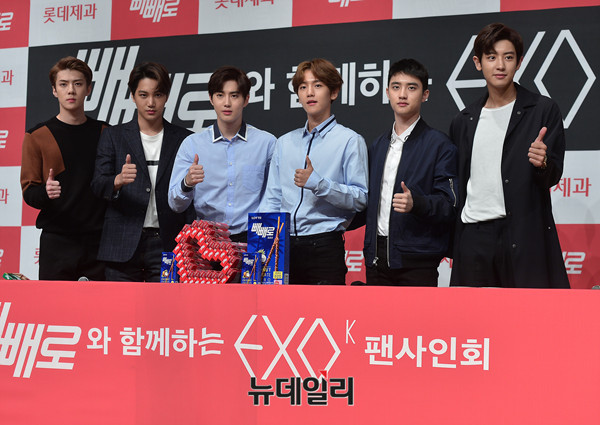 아이돌그룹 엑소K(디오, 백현, 세훈, 수호, 찬열, 카이)가 2일 오후 서울 강남구 일지아트홀에서 열린 '빼빼로와 함께하는 엑소K 팬사인회'에 참석해 인사를 하고 있다.