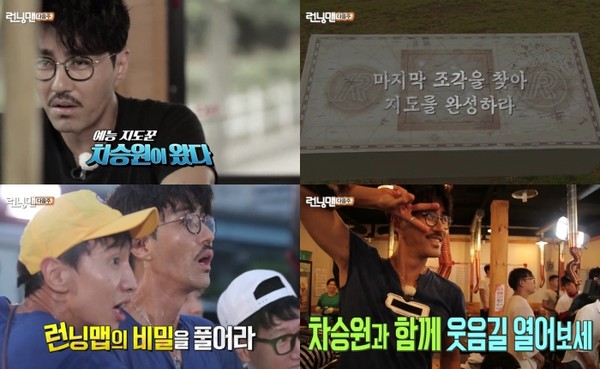 지도꾼 '고산자 김정호'로 완벽 변신한 배우 차승원이 '런닝맨'에 첫 출격한다.차승원은 4일 방송될 SBS '일요일이 좋다-런닝맨'에 출연해 유쾌한 입담과 물 오른 예능감으로 시청자들의 마음을 사로잡을 예정이다.이날 방송은 역사상 가장 위대한 '대동여지도'를 탄생시킨 지도꾼 김정호의 콘셉트에 맞춰 서울 시내 곳곳을 달리며 '런닝맵' 지도를 완성해나가는 추격전을 선보인다.차승원은 촬영 당시 유재석과 짝을 이뤄 폭염 속 서울 시내를 달리며 지도의 비밀을 풀기 위해 다양한 미션을 수행했다.차승원이 출연하는 SBS '런닝맨'은 9월 4일 오후 6시 30분 방송된다.['런닝맨' 차승원, 사진=SBS 방송 화면 캡처]