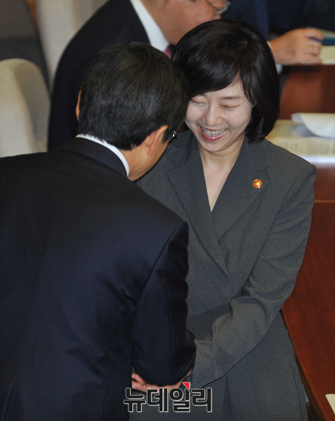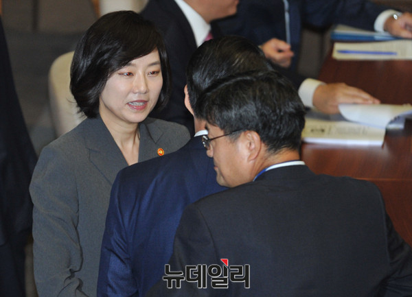 조윤선 신임 문화체육관광부 장관이 5일 오후 국회에서 열린 본회의에서 국무위원들과 인사를 나누고 있다.