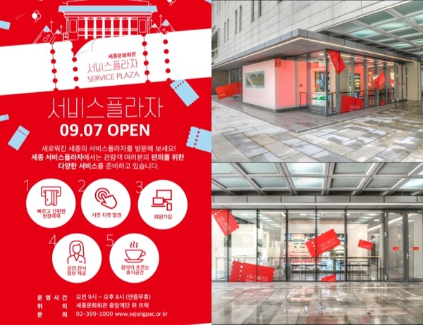 세종문화회관의 '서비스 플라자'가 시민들이 머물고 싶은 문화예술쉼터로 탈바꿈한다.7일 오픈한 '서비스 플라자'는 세종뜨락 위에 위치해 있던 구 티켓박스를 확장, 리모델링해 새롭게 단장한 공간으로, 기존 티켓예매 및 안내 서비스를 넘어 일상적 문화예술향유가 가능하다.이승엽 세종문화회관 사장은 "세종문화회관이 시민들에게 찾아오고 싶어 하는 문화예술공간으로 거듭나야 할 때"라며 "고객서비스 기능적 충실함은 물론 시민 스스로가 찾아오고 싶어 하는 공간적 리뉴얼도 고민해야 할 시기"라고 취지를 밝혔다.이에 '서비스 플라자'로 명칭을 변경했으며, 티켓 예매를 할 수 있는 공간 뿐 아니라 기존에 부족했던 휴게 공간을 신설했다. 또 영상, 전단 등 각종 홍보물을 통해 세종문화회관의 콘텐츠를 공유하고 즐길 수 있는 공간으로 보완했다.리모델링 역시 기능적인 고객서비스의 개념을 넘어 박스 형태로 조성된 건물에 외관 LED 조명을 활용해 시즌별 다양하게 연출될 예정이다. 접근성을 높일 뿐 아니라 광화문 거리에 또 다른 볼거리를 제공할 것으로 기대를 모은다.한편, 세종문화회관은 '서비스 플라자' 오픈을 기념해 9월 7일부터 30일까지 현장을 방문하는 고객을 대상으로 에코 파우치, 공연 및 전시 초대권 등 푸짐한 선물 제공과 100% 당첨 즉석복권, 공연 할인 등 다양한 이벤트를 펼친다.세종문화회관 서비스 플라자는 오전 9시부터 오후 8시까지 연중무휴로 운영하며, 누구나 이용할 수 있다.[사진=세종문화회관]