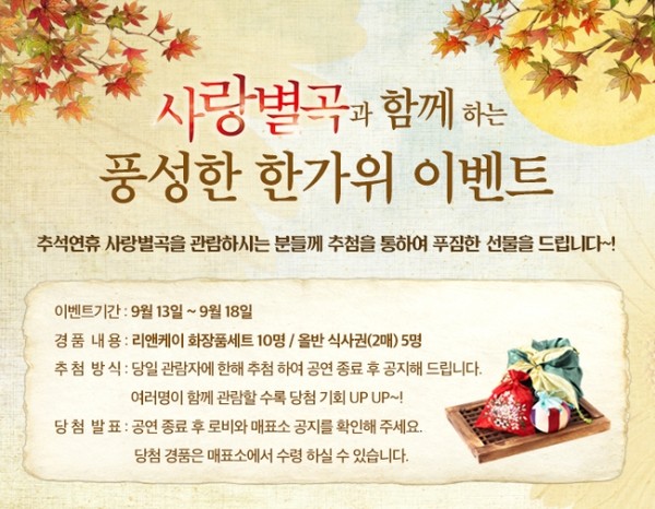 연극 '사랑별곡'이 한가위 황금연휴를 맞아 풍성한 이벤트로 관객몰이에 나선다.먼저 오는 13일부터 16일까지 공연 예매 시, 2인 기준 5만원에 구매할 수 있는 '추석 연휴 할인'을 마련했다.또, 공연장을 찾아온 관객들에게 감사의 마음을 담아 13일부터 18일까지 매 공연마다 유료관객을 대상으로 추첨을 통해 리엔케이 화장품세트(10명)과 올반 식사권(2매/5명) 등의 선물을 증정한다연극 '사랑별곡'은 강화도의 한 시골 장터를 배경으로 우리네 부모님의 정(精)과 한(恨)의 정서를 노부부 '순자와 박씨의 이야기로 군더더기 없이 풀어낸 작품으로, 노부부 각자의 가슴에 묻어둔 진심과 사랑을 가슴 뭉클한 순애보로 그려냈다.특히 이번 공연에는 이순재, 손숙, 고인배 등 대한민국을 대표하는 명품배우들이 대거 캐스팅 됐다. 한 편의 아름다운 시 같은 무대만큼 연륜에서 우러나오는 배우들의 연기 앙상블을 만나볼 수 있어 개막과 동시에 관객들의 뜨거운 호응을 얻고 있다.지난 4일 개막한 연극 '사랑별곡'은 10월 1일까지 동국대 이해랑 예술극장에서 공연된다.